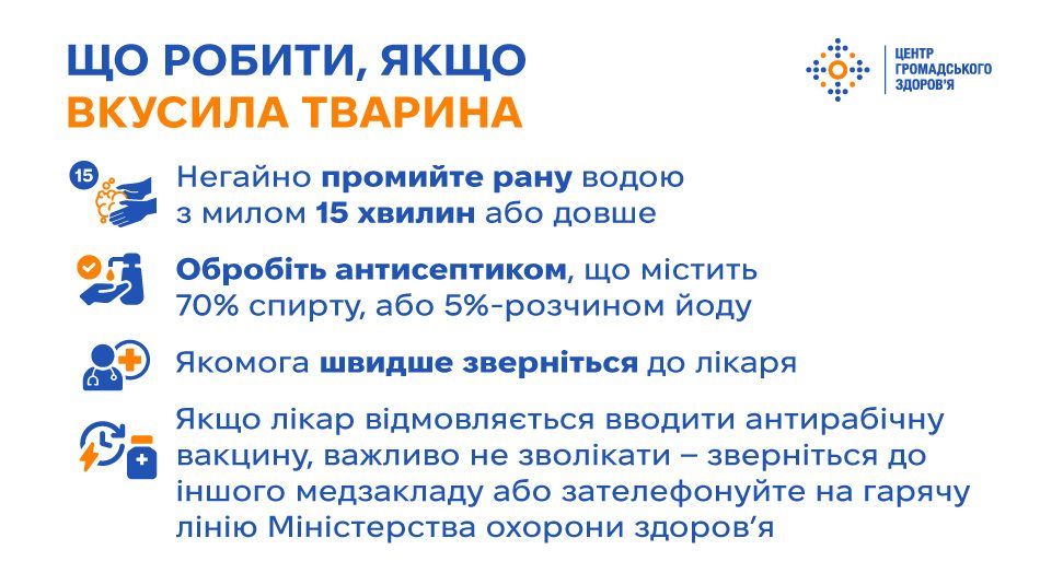 Якщо лікар відмовляється вводити антирабічну вакцину, важливо не зволікати — зверніться до іншого медзакладу або зателефонуйте на гарячу лінію Міністерства охорони здоров’я за номером 0 800 505 201. Перелік закладів, де проводять антирабічну вакцинацію, можна знайти за цим посиланням.